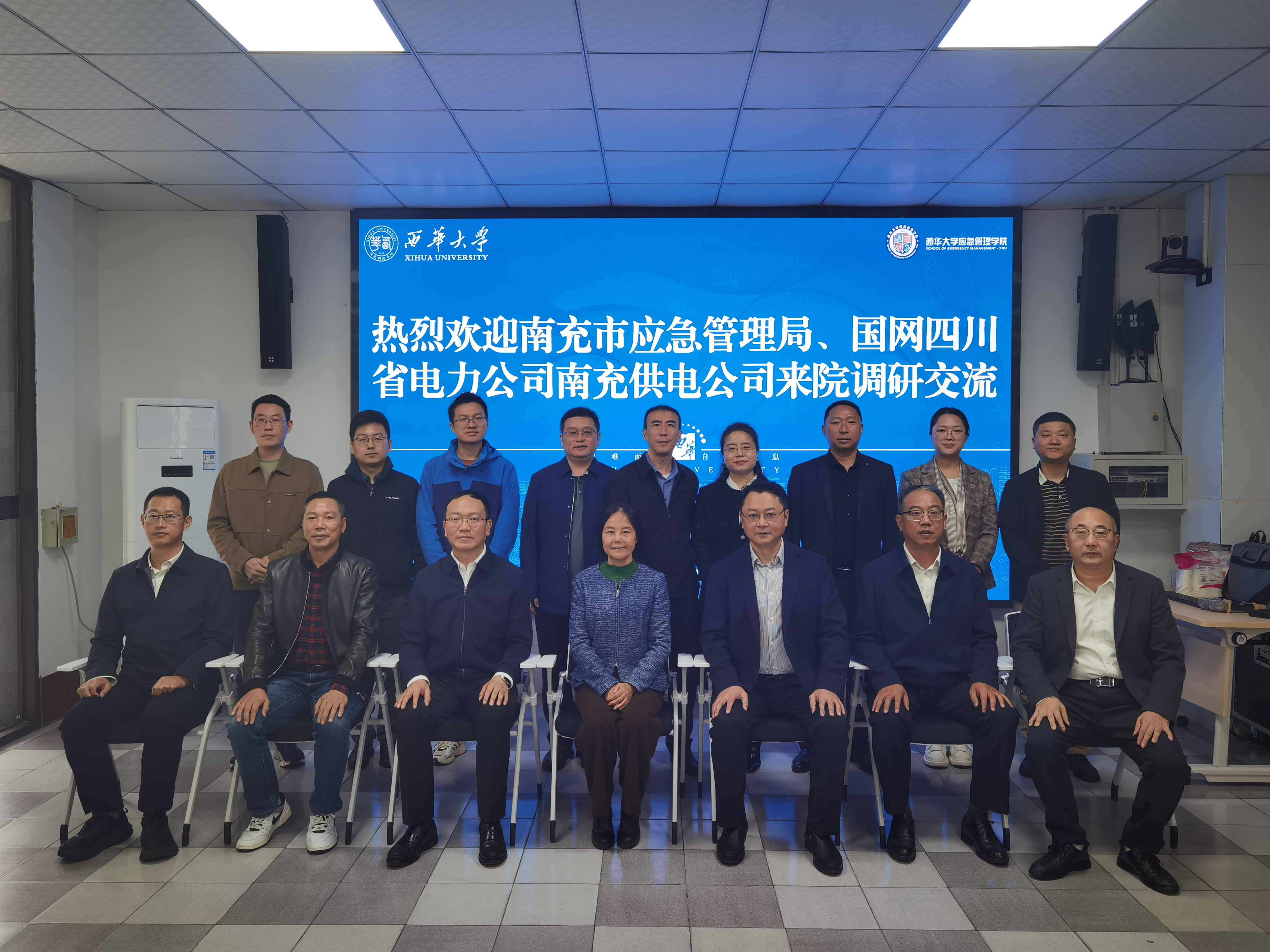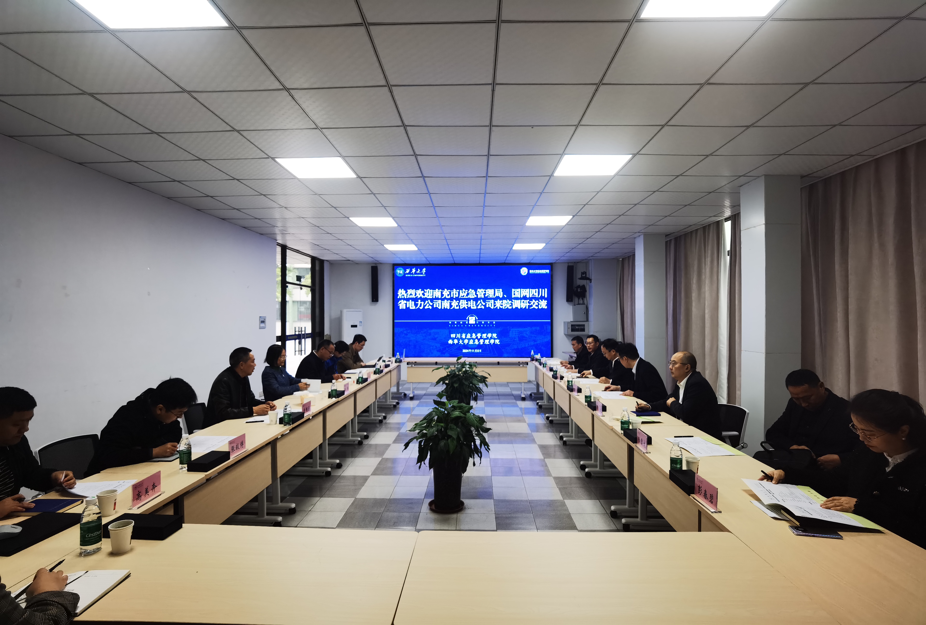11月8日,南充市应急管理局、国网南充供电公司赴应急管理学院调研交流,三方在彭州校区二教一楼会议室举行座谈交流会。南充市应急管理局党委书记、局长何涌泉,党委委员、副局长万伦;国网南充供电公司总经理、党委副书记曹海泉,党委委员、副总经理张大猛;西华大学发展规划与学科建设处处长王军,应急管理学院党委书记曾国勇,应急管理学院院长舒志乐出席座谈会。会议由曾国勇主持。